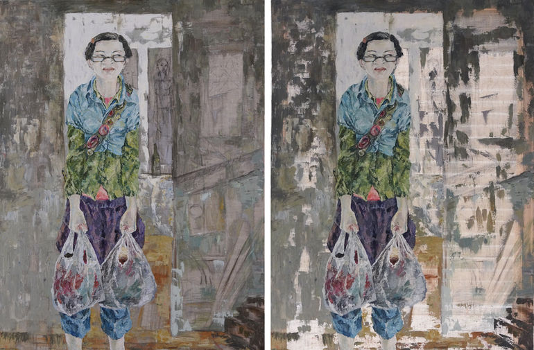 Just like a memory has missing pieces, these paintings change too as the light gets stronger in the background. The paintings are on loosely woven linen primed only under the characters, the surrounding is created without continuous solid paint, through the resulting gaps light can come through from behind.